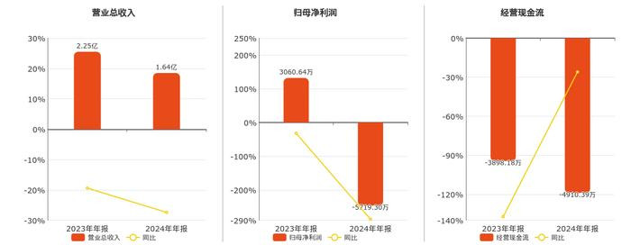 公司营业总收入为1.64亿元,在已披露的同业公司中排名第55,较去年同报告期营业总收入减少6175.26万元,同比较去年同期下降27.39%。归母净利润为-5719.30万元,在已披露的同业公司中排名第37,较去年同报告期归母净利润减少8779.94万元,同比较去年同期下降286.87%。经营活动现金净流入为-4910.39万元,在已披露的同业公司中排名第39,较去年同报告期经营活动现金净流入减少1012.21万元。
